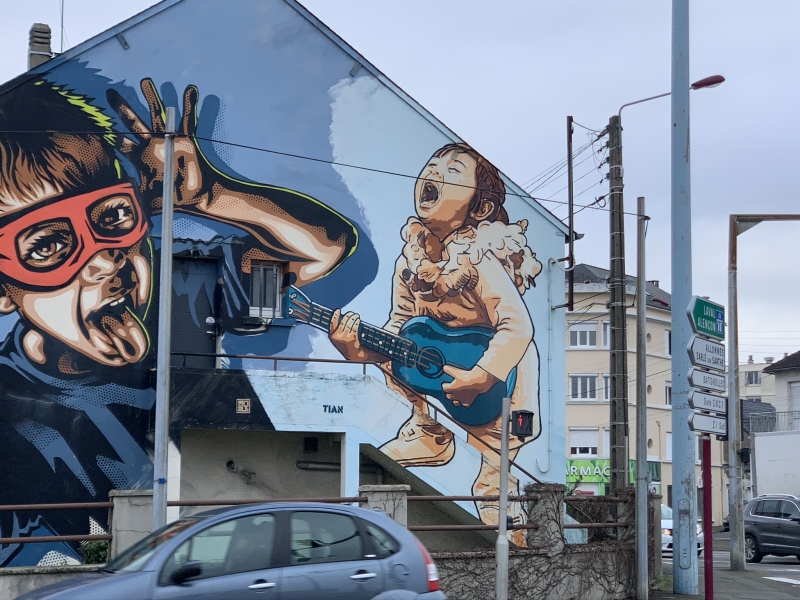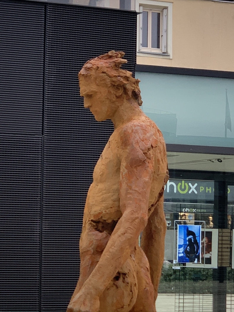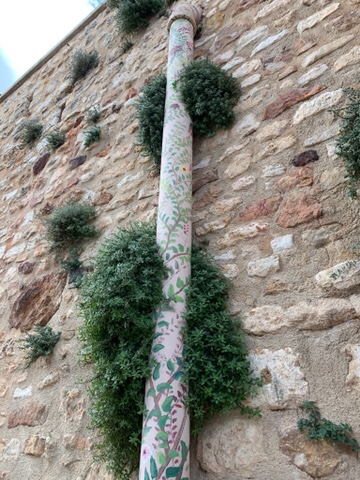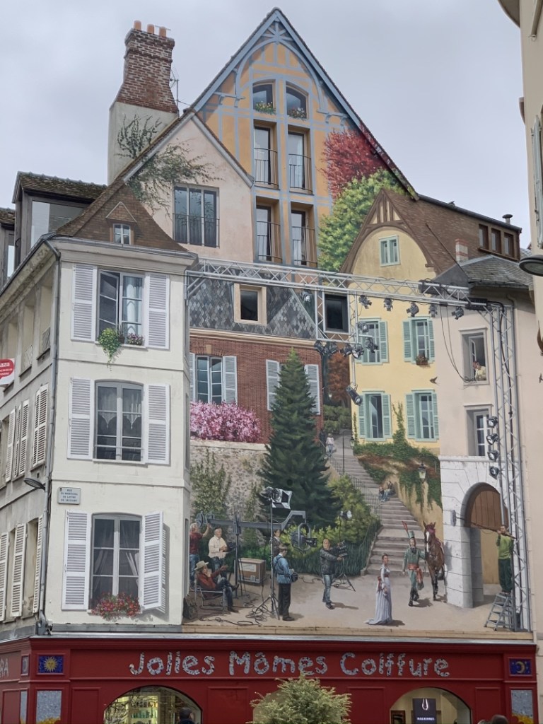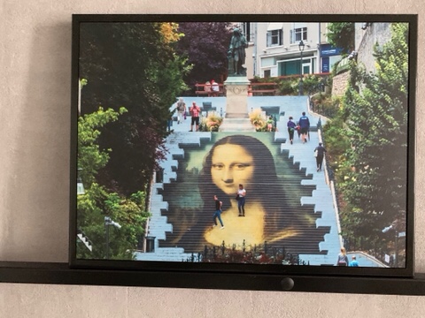 One of the more recent touristy additions to Blois is the Escalier Denis Papin. This is a staircase of 120 steps, named after Denis Papin, an inventor from Blois who designed the steam engine. The staircase links the upper town with the lower town and, since 2013, the risers have been “dressed” in giant artwork responding to what’s happening in town. The Mona Lisa was a previous display and the other photos below is what is looks like now.