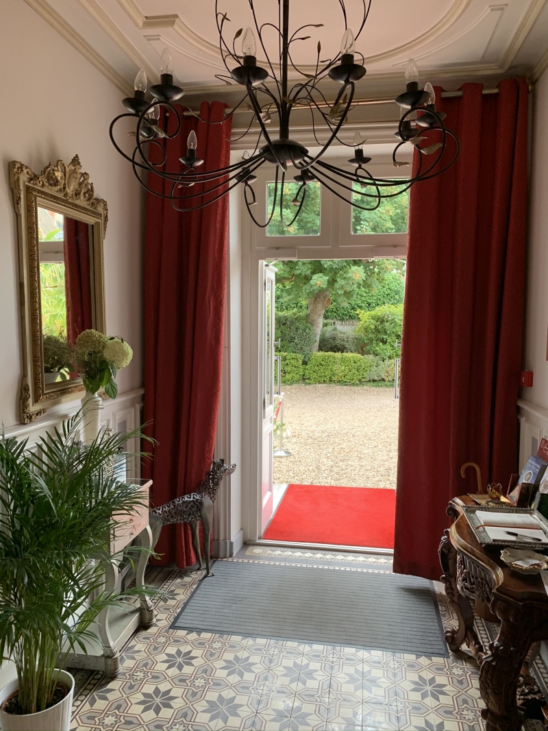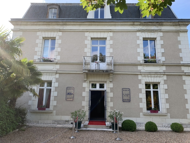 We stayed in Amboise and had fantastic accommodation right in the heart of town. We are guessing that it was originally a house for someone with a bit of wealth and we stayed in probably what was the caretaker’s cottage in the grounds. The photos below show the front door of the hotel, from inside and outside and the entry to our cottage. And the photo taken looking down on the town shows our cottage (circled).