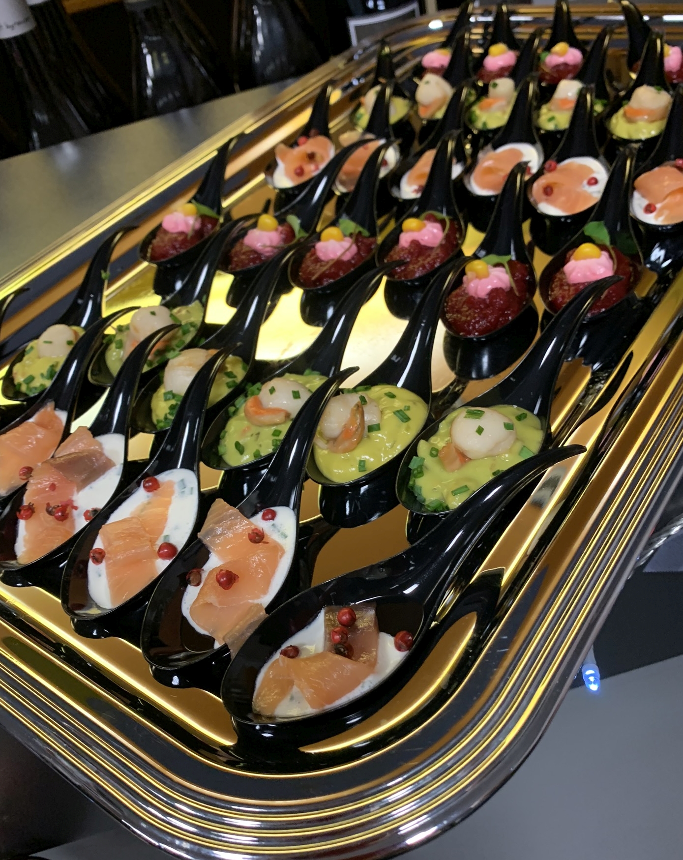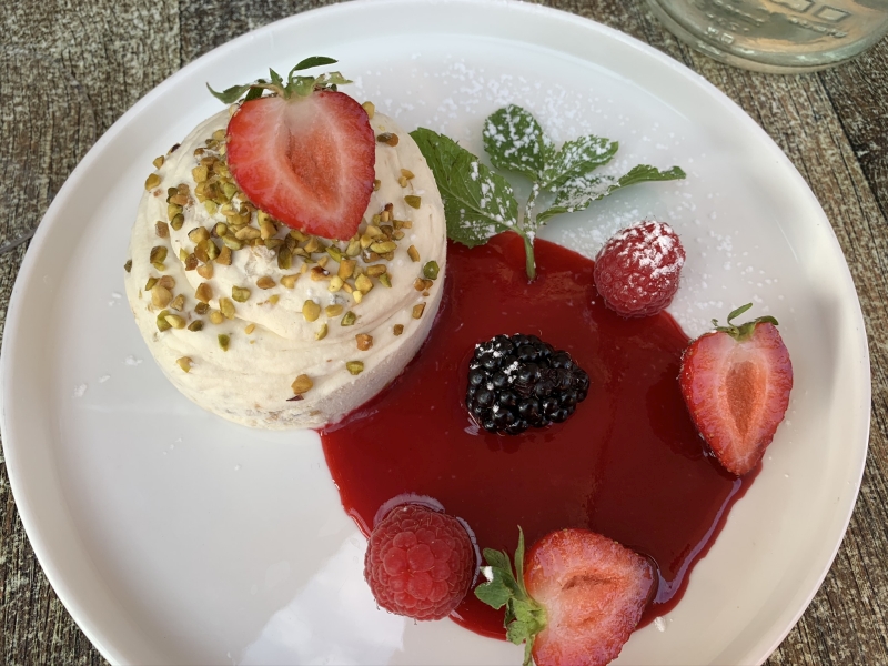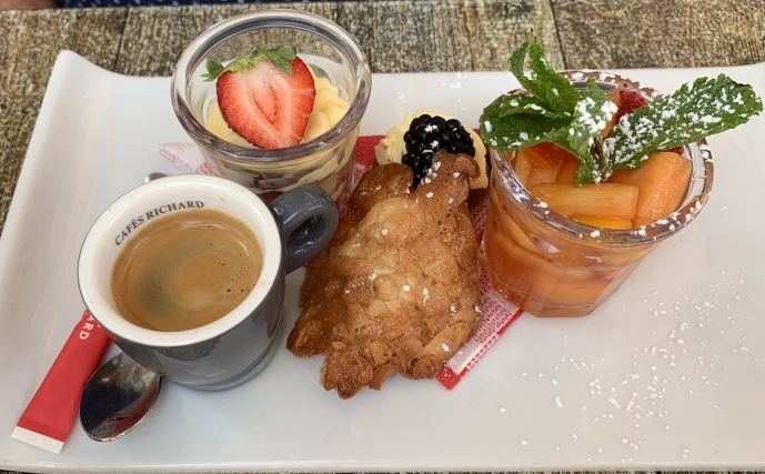 Chateau #1 done. Time for wine tasting and dinner. The photos below demonstrate how the French know how to plate up food. The black plate is basically a piece of fish with mashed potato and veges. On the right is vanilla ice cream with fruit. The bottom picture is cafe gourmand – coffee with a few small tasting size desserts of (this time) vanilla custard, apple dumpling and fruit salad. Of course the menu descriptions were several sentences for each dish but our French must be improving because we are not reaching for Google translate nearly as often these days.