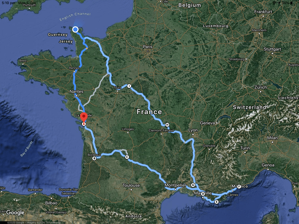 So now we are back in Cherbourg. Here’s a map of our trip. Over 4000 kms, 9 hotels, countless face masks and many fantastic memories.