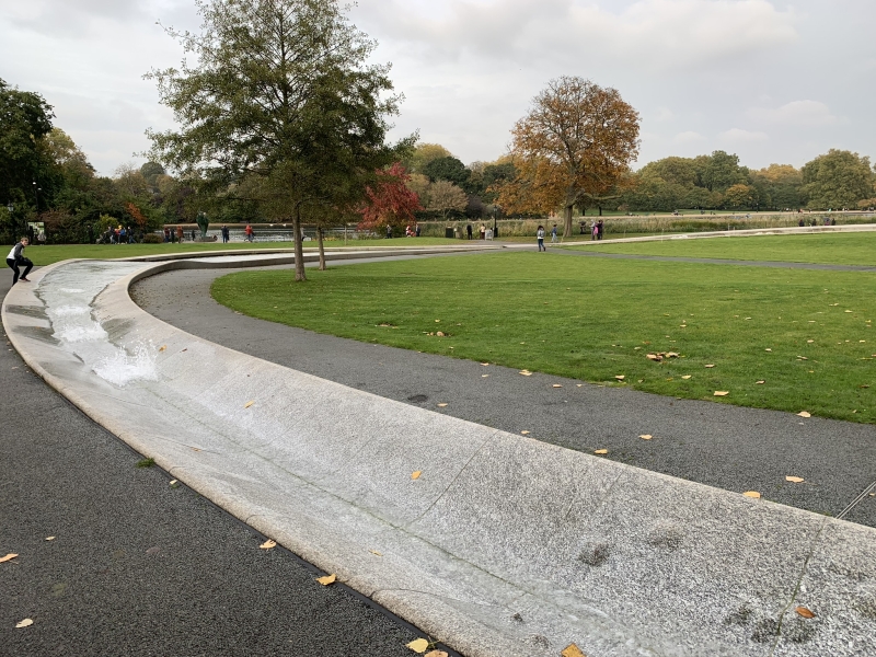 In between the downpours we walked through Hyde Park and checked out the Princess Diana Memorial Fountain. Apparently it was designed to “express Diana’s spirit and love of children“. It was made from 545 pieces of Cornwall granite, ” each shaped by the latest computer-controlled machinery and pieced together using traditional skills“. It probably cost an eye-watering amount but to us it just looked very much like an open drain.