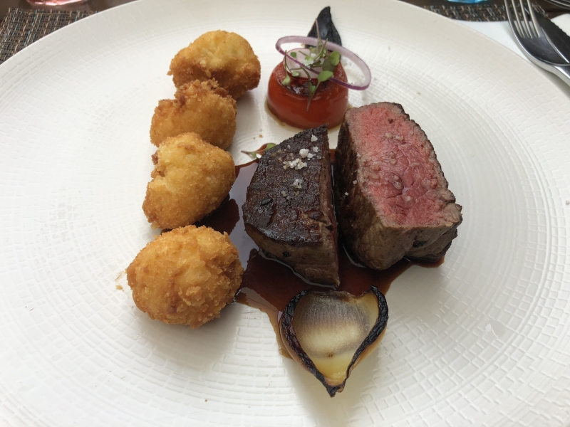 Fried steak, jus reduction, roasted tomato in balsamic vinegrait and dauphinoise potatoes in panko crumbs.